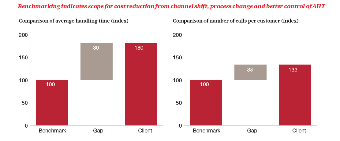We found that on three key areas, our client was underperforming best practice, with (1) higher numbers of contact per customer – an indicator of process failure; (2) the time taken by personnel to resolve a customer query outside industry norms and (3) their unit labour cost (cost per productive minutes) was too high. This represented significant scope for cost reductions, with many ‘quick win’ projects that were not dependent on significant investment or long lead time IT change.
