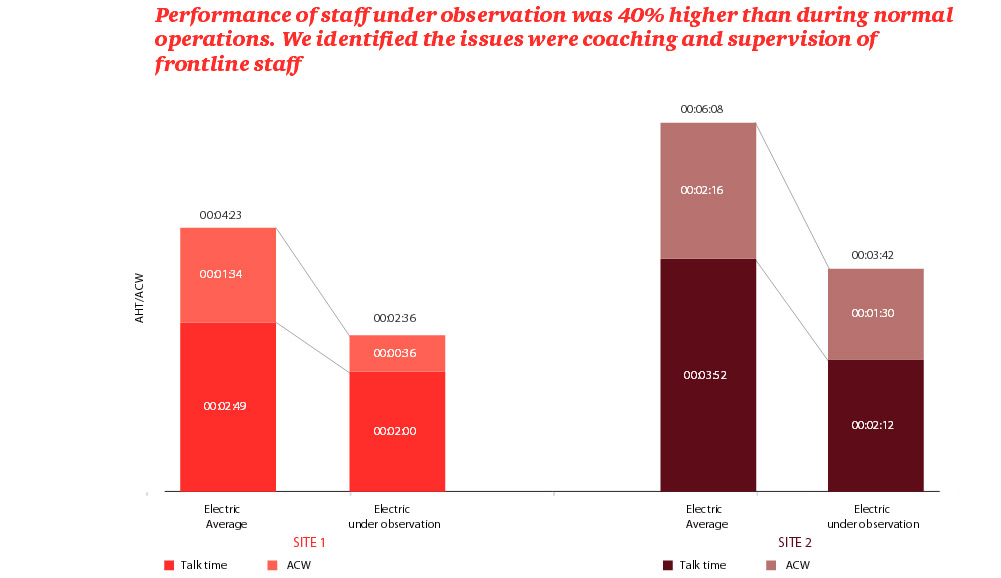 To determine the root cause of why call volumes were so high, 2000 calls were monitored, codified and analysed. This showed extensive use of message taking – an attempt to meet service levels – and low rates of first call resolution. More important, the average handling time for monitored calls was 40% less than normal calls. David hypothesised that better supervision would decrease call handling times and allow current staffing levels to cope with demand. He proposed a team management improvement pilot to prove that better CSA supervision would yield results. David’s team selected test and controls teams, managed HR stakeholders to refresh supervisor training, and mobilised supervisors to use the new practices. Performance league tables were set up. At the end of six weeks, the pilot proved significant productivity improvements. David developed a roll out plan for SP which it implemented at both its SP legacy and Manweb acquisition.