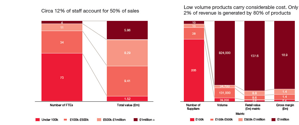 David led activity to analyse the cost base, understand its drivers, identify cost savings opportunities and quantify them. His team analysed P&L detail on operations in three countries, data on customer transactions by channel and product, and operational data from call centre and retail channels. This was used to create ‘data packs’ for management, converting data and analysis into insights, prove the rationale and quantify cost saving initiatives. Some examples: